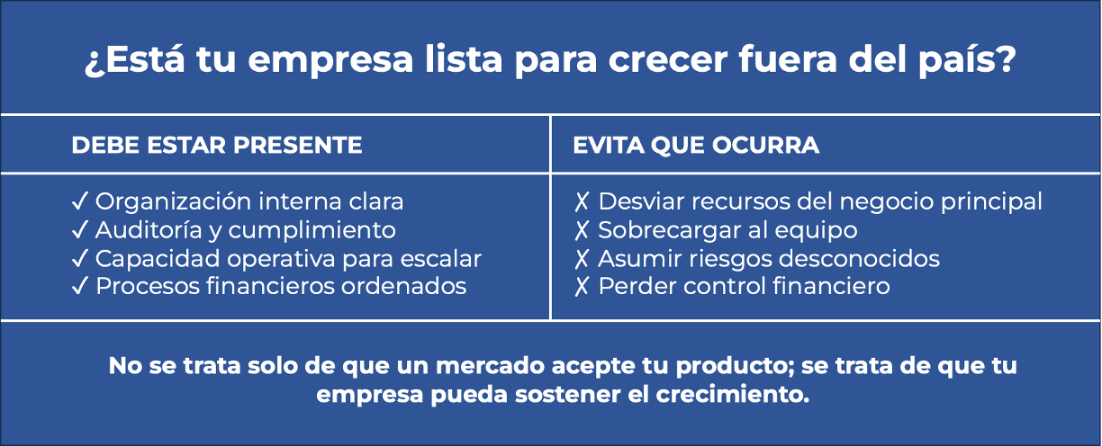 El reto más grande es determinar si la empresa está realmente preparada para operar fuera del país sin poner en riesgo su estructura local. Ingresar a un mercado extranjero requiere análisis financiero, revisión profunda de procesos, evaluación de capacidades internas y claridad sobre si el producto o servicio puede competir en entornos con mayores exigencias. No basta con que un mercado acepte el producto; es necesario que la empresa esté organizada, auditada y fortalecida para sostener el crecimiento. Sin este enfoque, la internacionalización puede desviar recursos esenciales del negocio principal y generar más riesgos que beneficios.